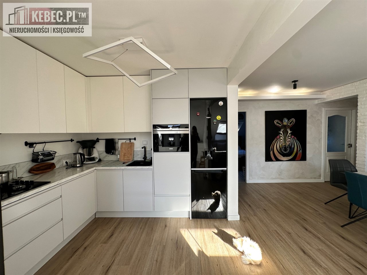 - pokoju dziennego połączonego z kuchnią (kuchnia umeblowana i wyposażona w podstawowe urządzenia AGD, lodówkę, kuchenkę z piekarnikiem, mikrofalę, okap, zmywarkę), na podłodze w kuchni i salonie położone panele,